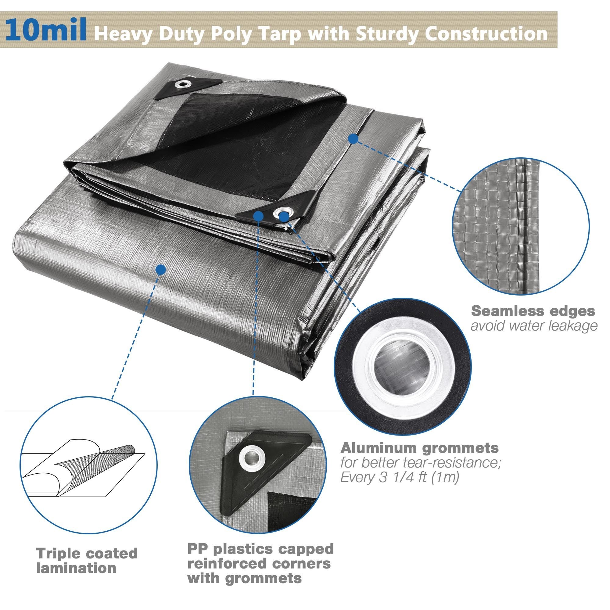 - Heavy Duty Sturdy Poly Tarp - Weights 4.06Lbs; 10mil heavy-duty thickness and aluminum grommets in 3 1/4 ft (1m) interval for better tear-resistance; PP plastics capped reinforced corners with grommets for sturdy construction; All seamless edges avoid water leakage