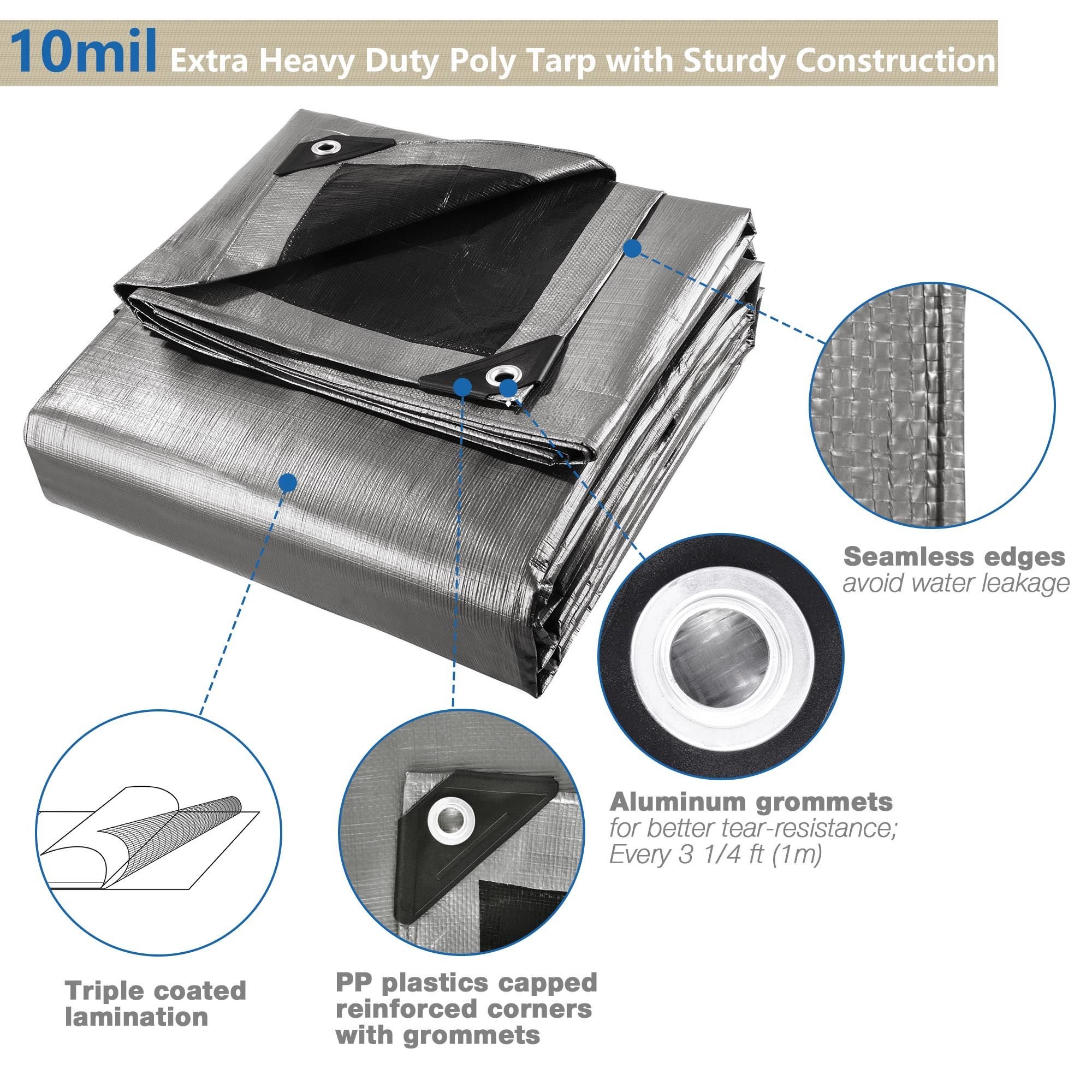 - Heavy Duty Sturdy Poly Tarp - Weights 9.72Lbs; 10mil heavy-duty thickness and aluminum grommets in 3 1/4 ft (1m) interval for better tear-resistance; PP plastics capped reinforced corners with grommets for sturdy construction; All seamless edges avoid water leakage
