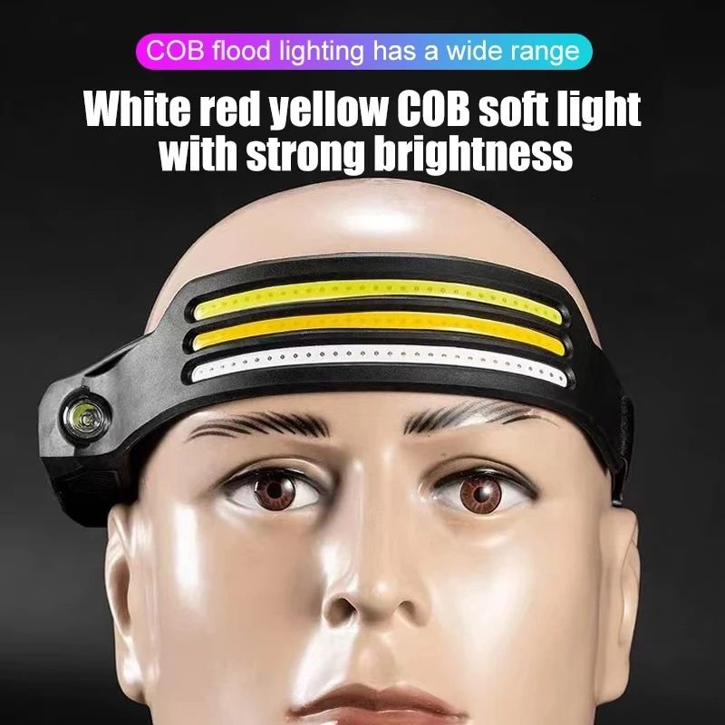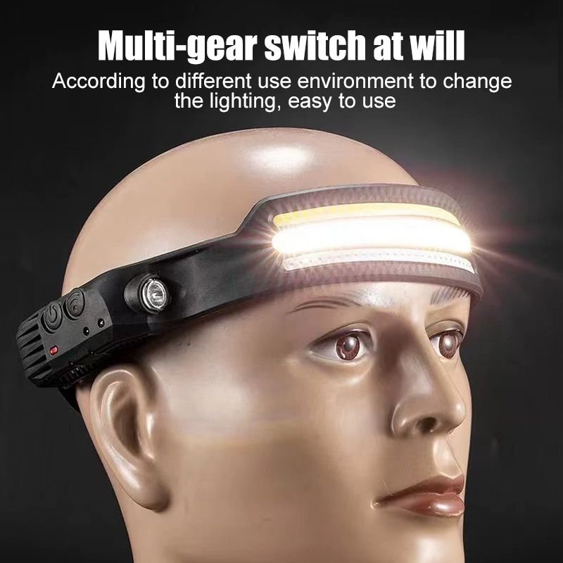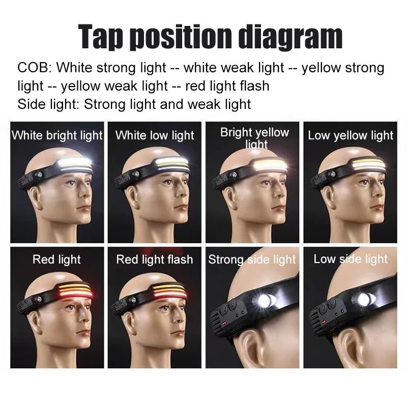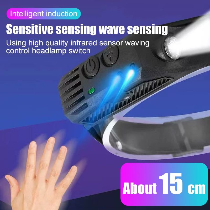 Wide bright beam —  230° wide-angle field of view and 350 lumens suitable for various outdoor scenes.USB charging function — The rechargeable built-in 1200mAh lithium polymer battery .Intelligent sensing technology –– Headlamps are equipped with the latest smart sensors. You can easily control the light on and off by waving your hand. (The induction area is located around the induction switch. When using this function, please turn on the headlamps and the induction switch at the same time)5 Light modes — The led headlamps can meet various lighting needs. It has 5 lighting modes: COB high mode, COB low mode, XPE high mode, XPE low mode, and strobe mode. You can adjust any light mode through the headlight switch. (Note: in any other mode, long-press the power button for 2 seconds to switch the strobe mode, at this time the COB and XPE light flash at the same time)Lightweight & Comfortable –— The headlamp flashlight has an easily adjustable elastic headband and two buckles. Its compact size and IPX4 water resistance are very suitable for running, camping, fishing, and outdoor adventures. (Easily adjusts to hard hats and helmets)