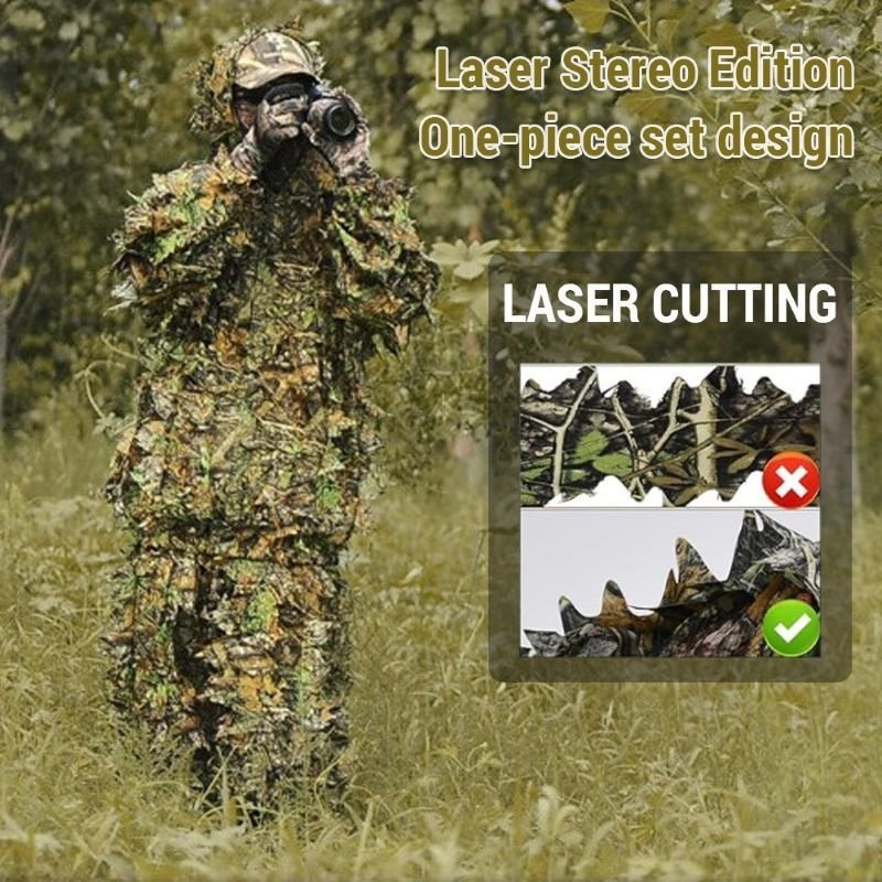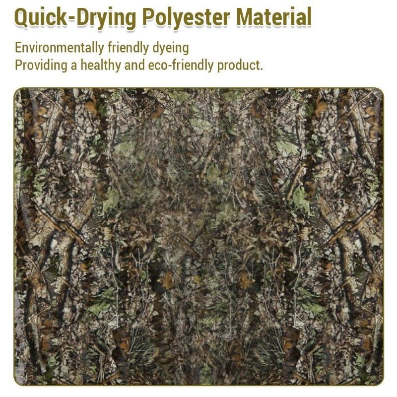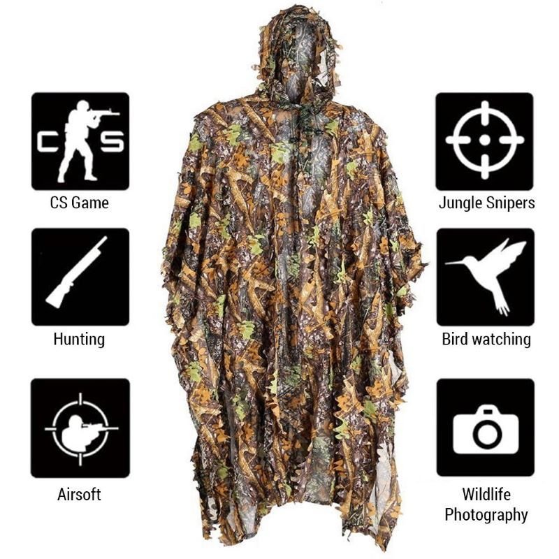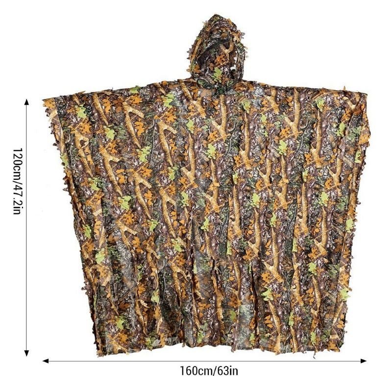 The cloak is made of quick-drying polyester material and features a unique woodland camouflage leaf design.