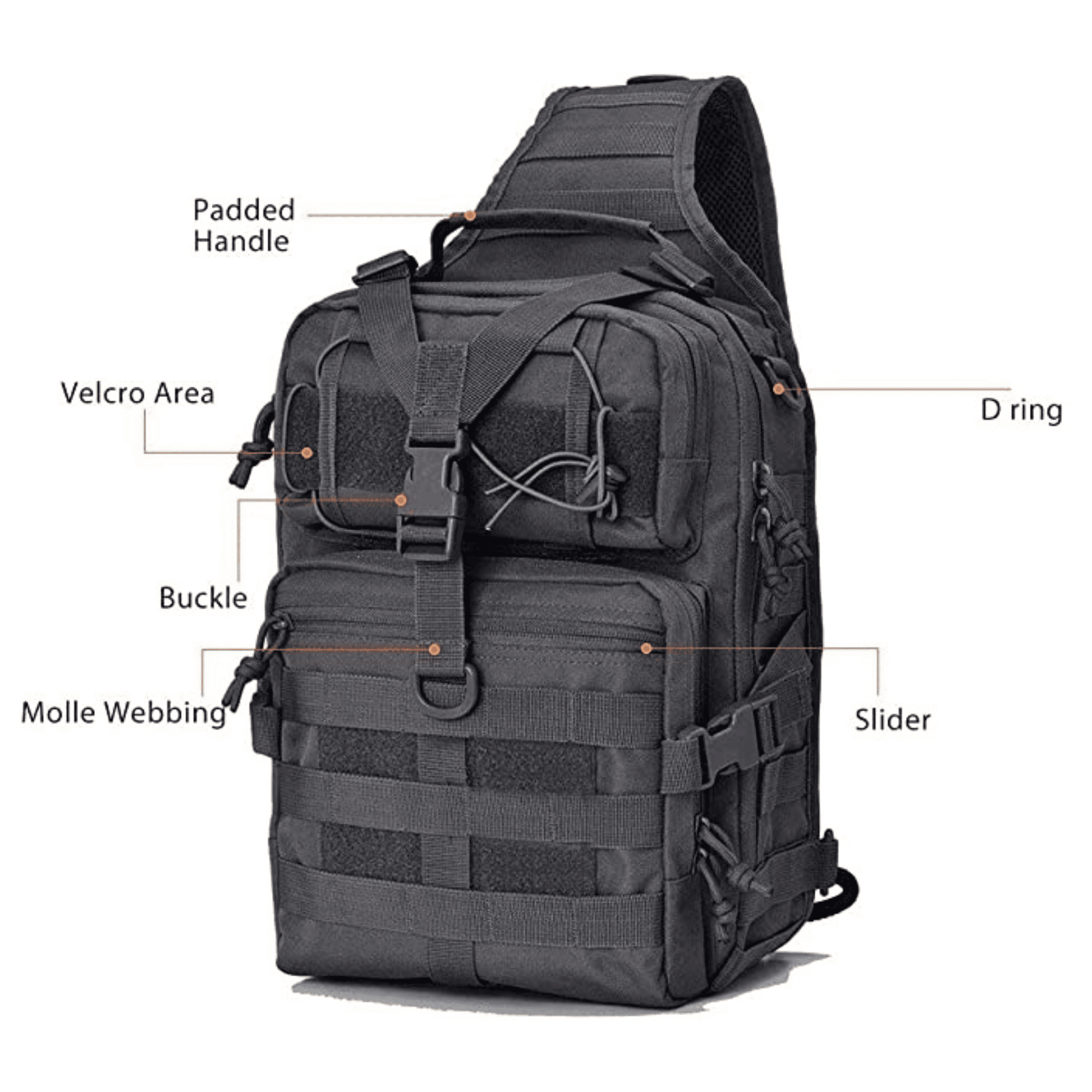 MOLLE SYSTEM: MOLLE webbing system is ideal for attaching flashlights, phone pouches, water bottle bags, and other MOLLE gear. The hook&loop on the front of the MOLLE Sling Backpack is designed for your own customized patch.