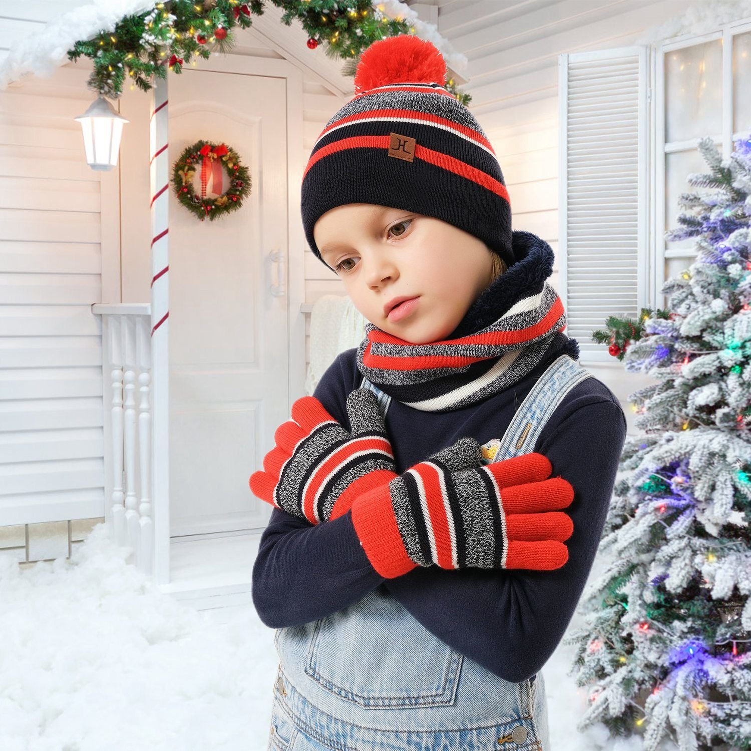 *3Pcs Winter Warm Gears*:These 3Pcs knitted winter set includes a kids beanie hat,a neck scarf and a pair of gloves,which is able to fully keep your child warm and comfortable when the temperatures drop.